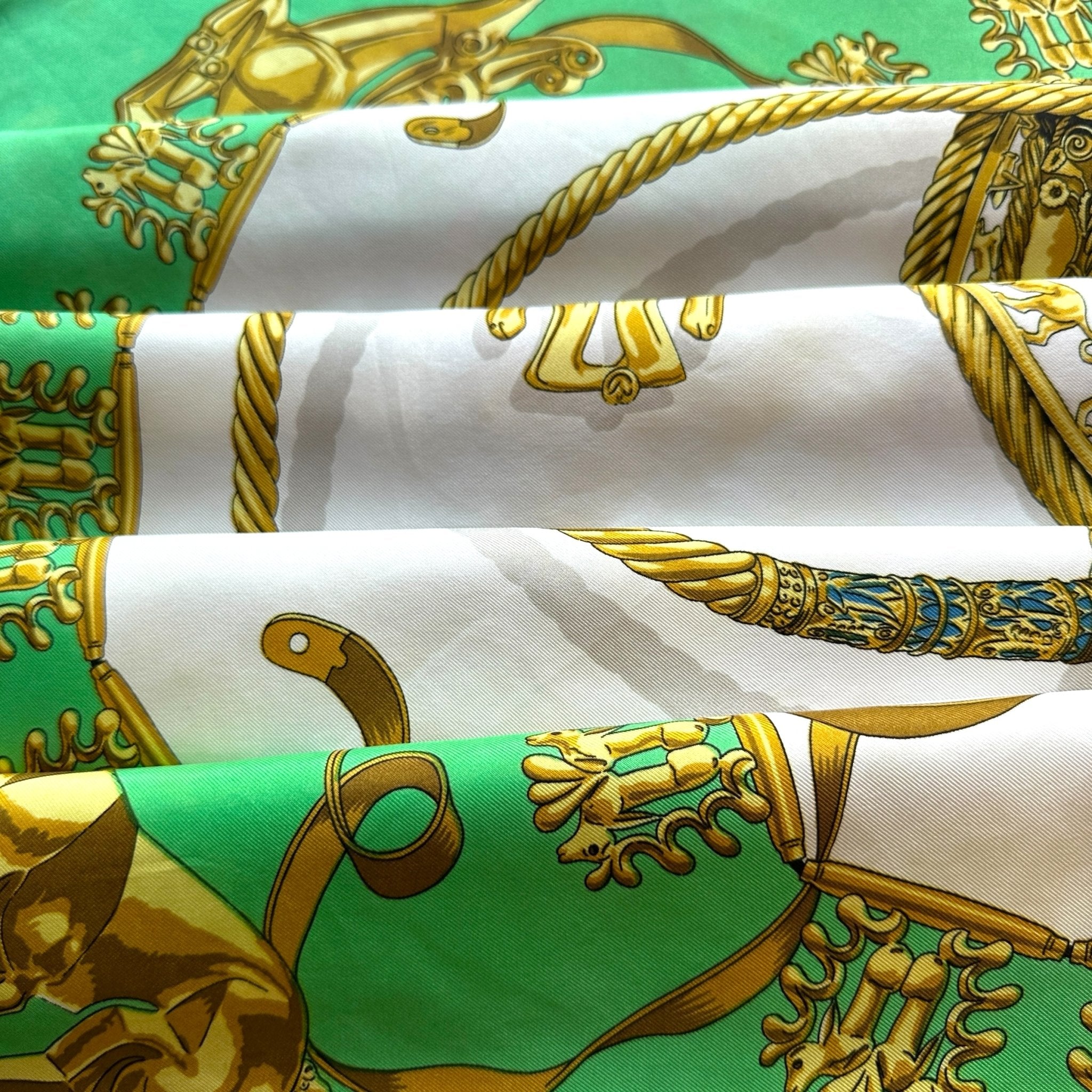 Foulard Hermès Les Cavaliers d’Or 90 cm en soie, dessin de Dimitri Rybaltchenko, fond vert et or