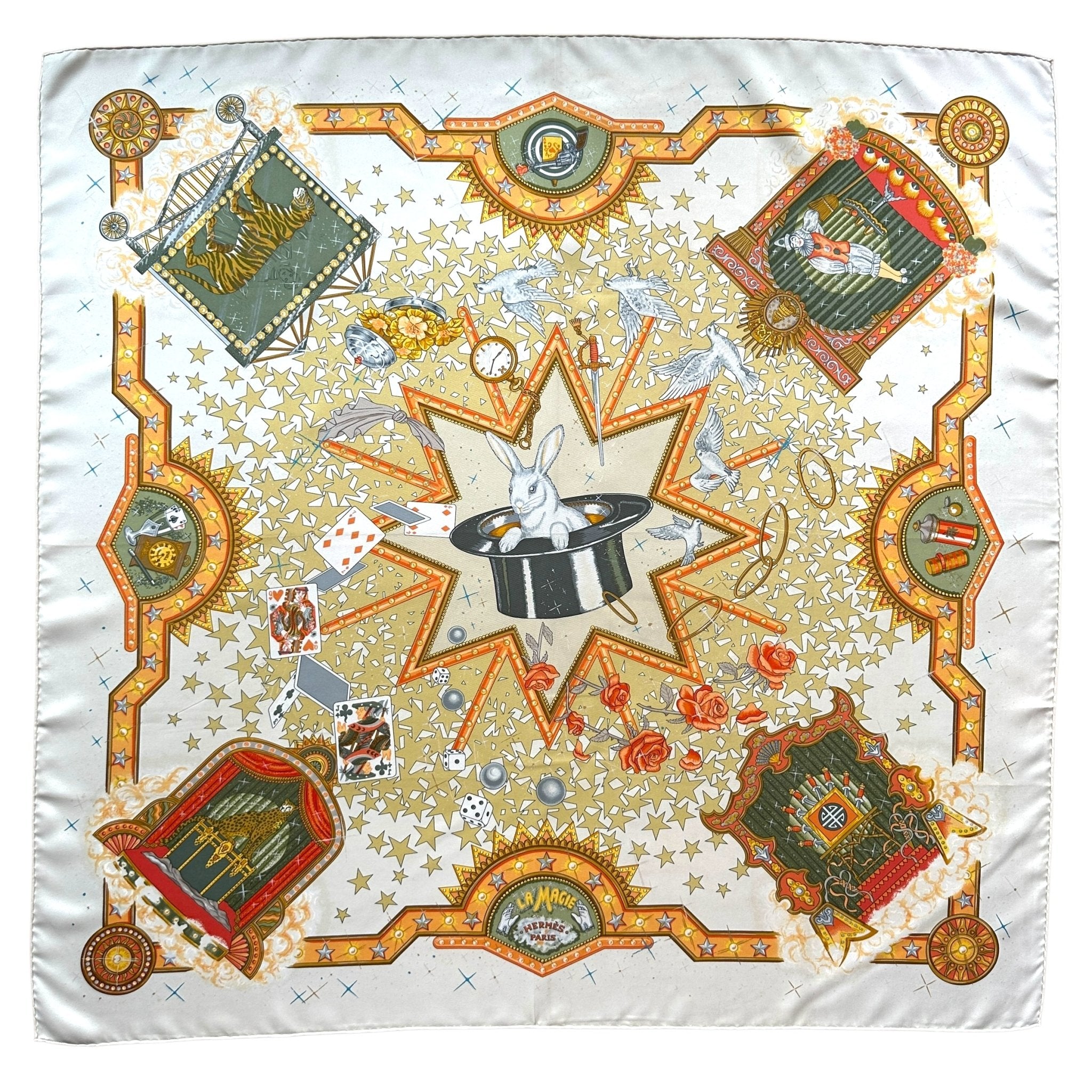 Créé par Claudia Stuhlhofer-Mayr pour la collection Automne-Hiver 1999, La Magie est un carré à la fois surprenant, foisonnant et profondément poétique. La composition mêle humour, illusion et enchantement dans un hommage vibrant à l’univers des magiciens. Réédité une seule fois en 2002, ce modèle est aujourd’hui rare et recherché par les collectionneurs.