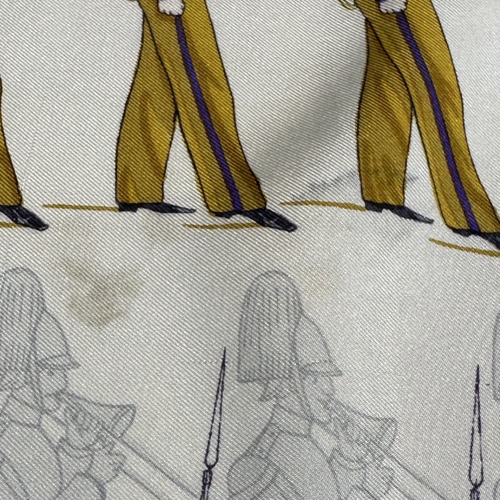 Le carré Hermès La Parade, dessiné par Françoise Héron, a été édité pour la première fois en 1966 et n’a jamais été réédité. Son motif met en scène des rangées de soldats défilant en uniforme, rythmés par une composition graphique à la fois sobre et puissante.